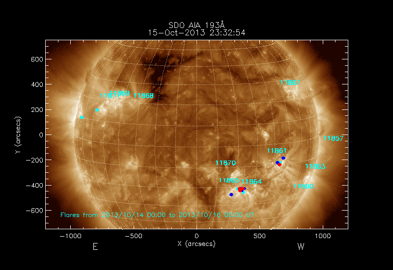 All soft X-ray flares (≥A1.0) where the location has been determined are shown; the flare locations are rotated to the time of the image