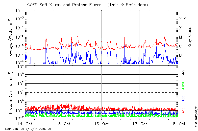 This page provides light-curves generated from GOES soft X-ray and Particle data for the date indicated at the top and the preceding three days.