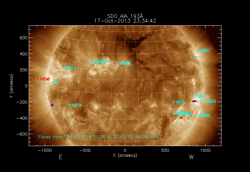 All soft X-ray flares (≥A1.0) where the location has been determined are shown; the flare locations are rotated to the time of the image