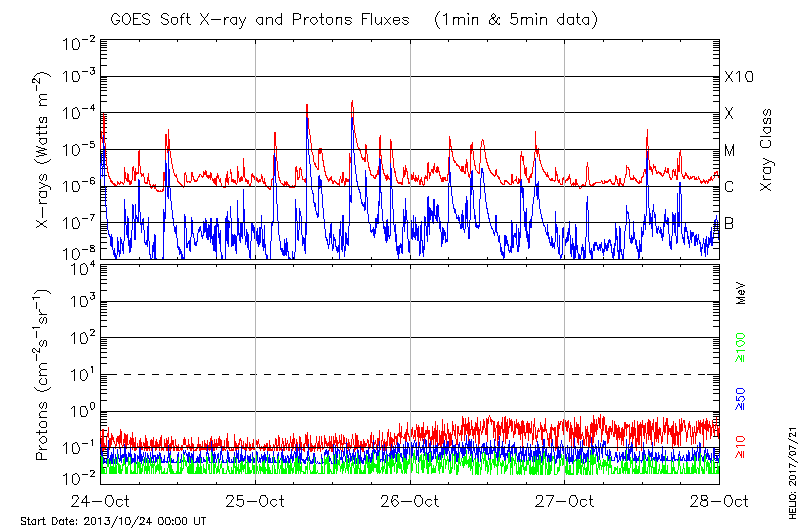 This page provides light-curves generated from GOES soft X-ray and Particle data for the date indicated at the top and the preceding three days.