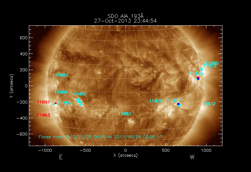 All soft X-ray flares (≥A1.0) where the location has been determined are shown; the flare locations are rotated to the time of the image