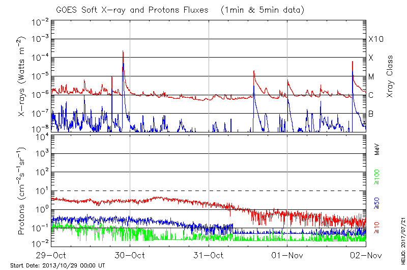 This page provides light-curves generated from GOES soft X-ray and Particle data for the date indicated at the top and the preceding three days.