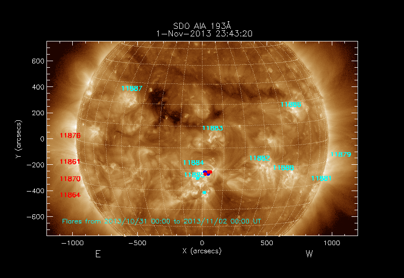Click on an Active Region plot to display the Region Report including the region evolution and flaring history. HEC Search for NOAA Active Regions (SRS) records for this date and the day before.