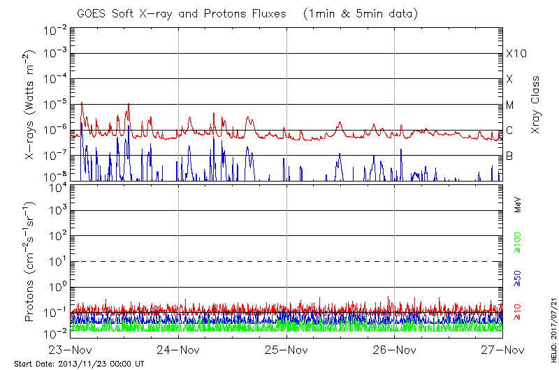 This page provides light-curves generated from GOES soft X-ray and Particle data for the date indicated at the top and the preceding three days.