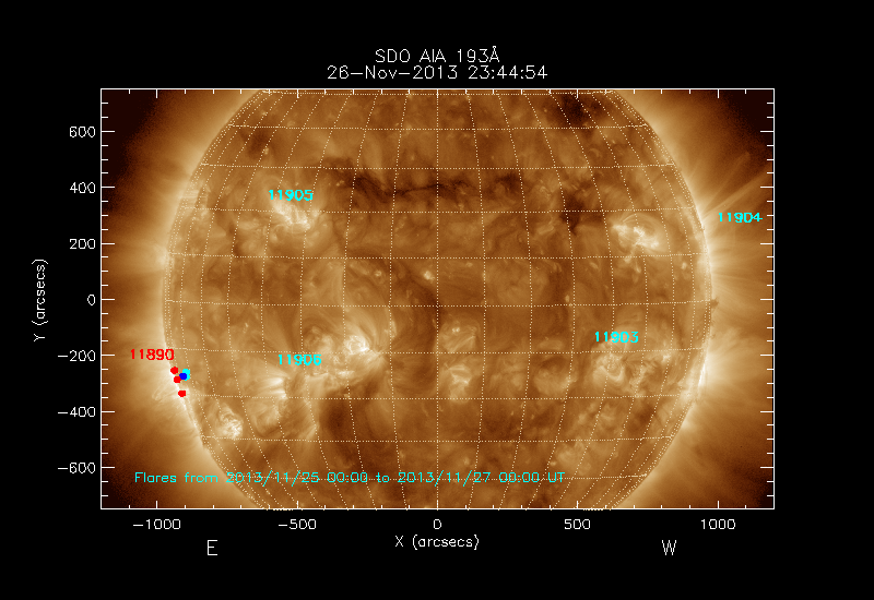 Click on an Active Region plot to display the Region Report including the region evolution and flaring history. HEC Search for NOAA Active Regions (SRS) records for this date and the day before.