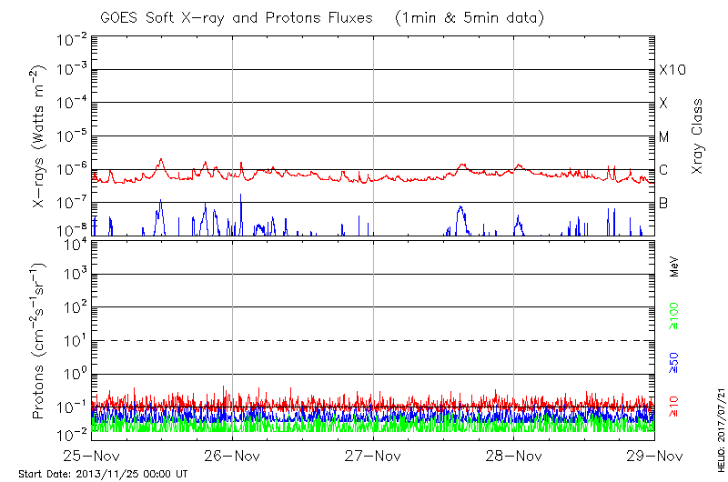 This page provides light-curves generated from GOES soft X-ray and Particle data for the date indicated at the top and the preceding three days.