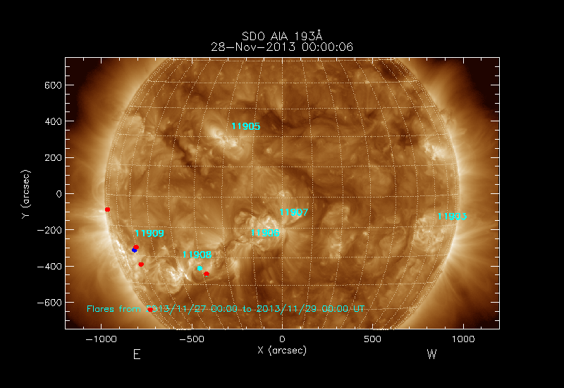 The most recent flares (≤12 hours) are shown as red dots, 12-24 hours ago as blue dots and older ones as turquoise dots.