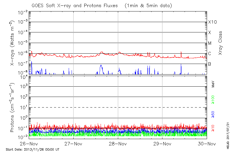 This page provides light-curves generated from GOES soft X-ray and Particle data for the date indicated at the top and the preceding three days.