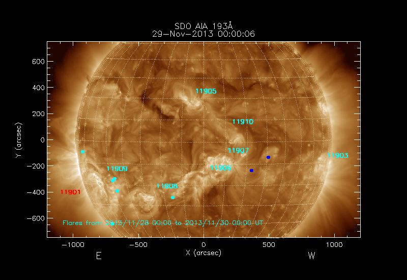 All soft X-ray flares (≥A1.0) where the location has been determined are shown; the flare locations are rotated to the time of the image