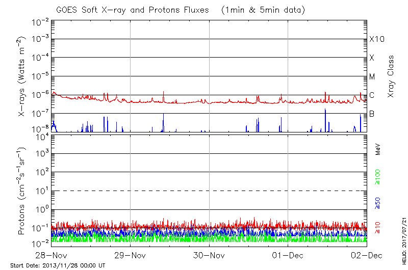 This page provides light-curves generated from GOES soft X-ray and Particle data for the date indicated at the top and the preceding three days.