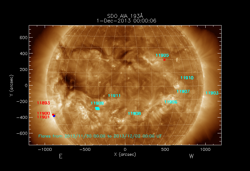 The locations of the flares over-plotted on the image are derived from the flare catalogue