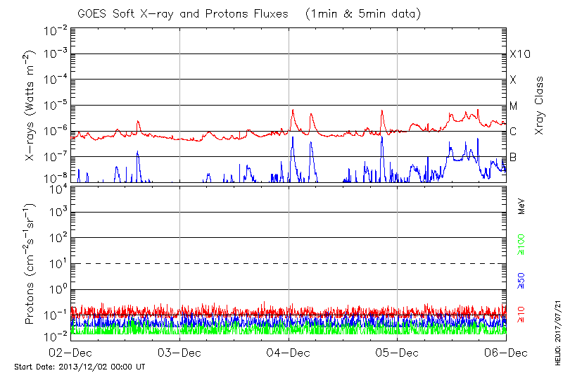 This page provides light-curves generated from GOES soft X-ray and Particle data for the date indicated at the top and the preceding three days.