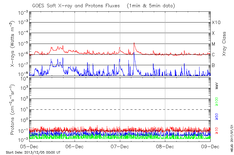 This page provides light-curves generated from GOES soft X-ray and Particle data for the date indicated at the top and the preceding three days.