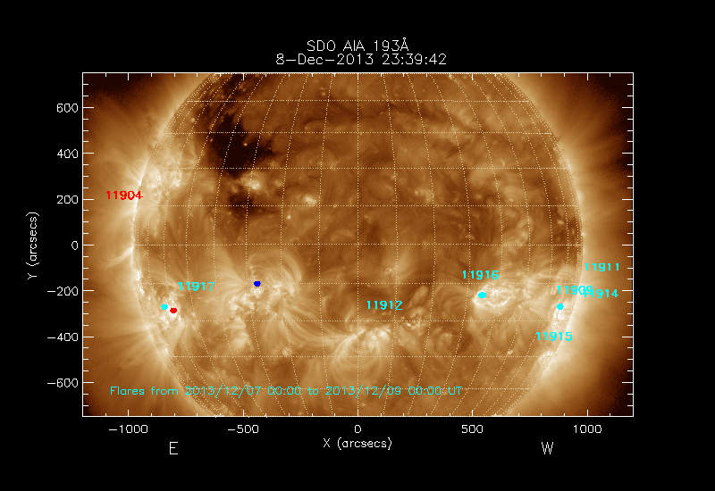 All soft X-ray flares (≥A1.0) where the location has been determined are shown; the flare locations are rotated to the time of the image