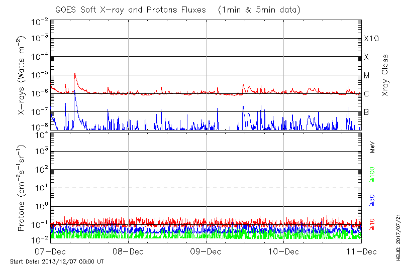 This page provides light-curves generated from GOES soft X-ray and Particle data for the date indicated at the top and the preceding three days.