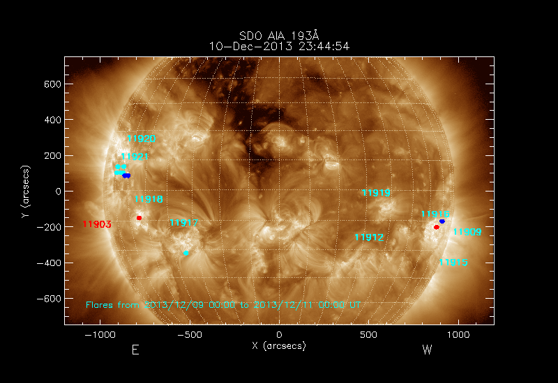 All soft X-ray flares (≥A1.0) where the location has been determined are shown; the flare locations are rotated to the time of the image