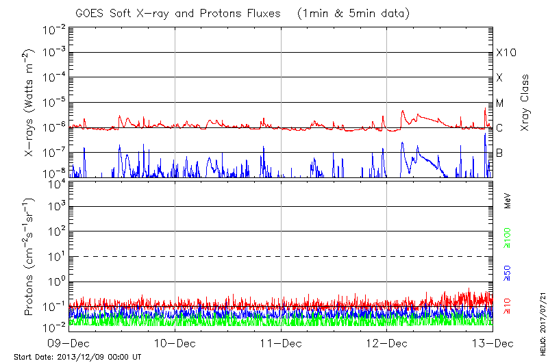 This page provides light-curves generated from GOES soft X-ray and Particle data for the date indicated at the top and the preceding three days.