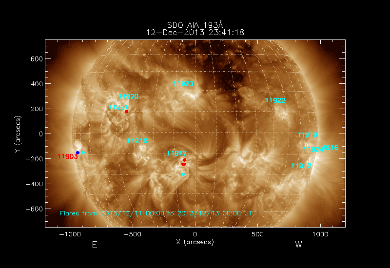 shows the locations soft X-ray flares that occurred within