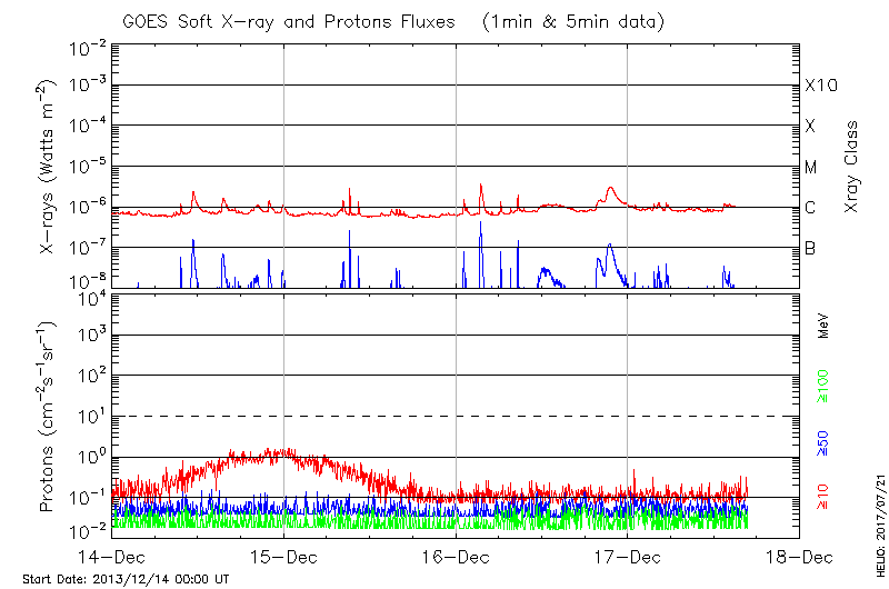 This page provides light-curves generated from GOES soft X-ray and Particle data for the date indicated at the top and the preceding three days.