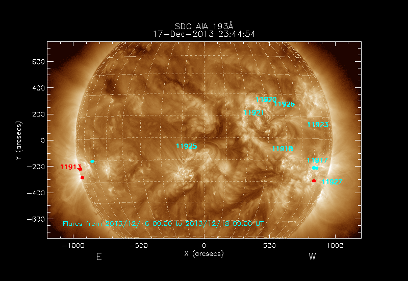 All soft X-ray flares (≥A1.0) where the location has been determined are shown; the flare locations are rotated to the time of the image