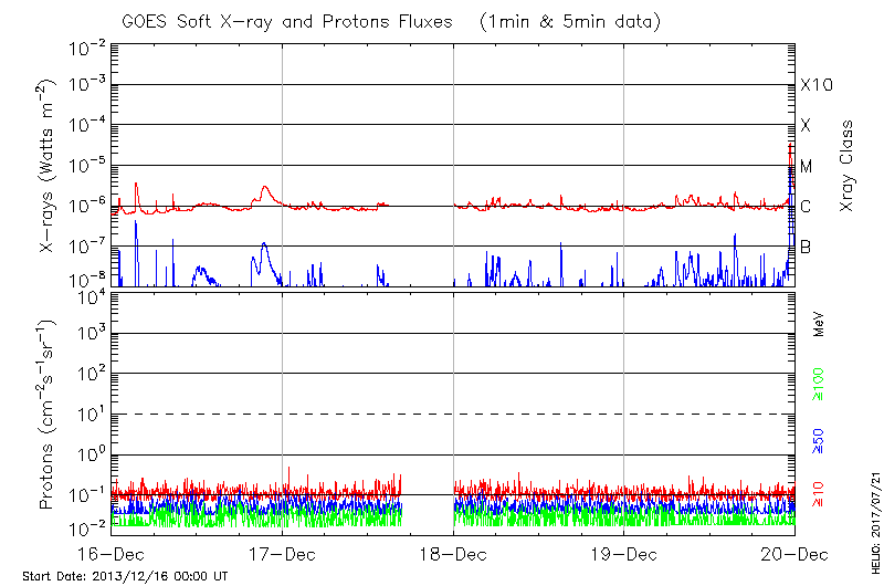 This page provides light-curves generated from GOES soft X-ray and Particle data for the date indicated at the top and the preceding three days.
