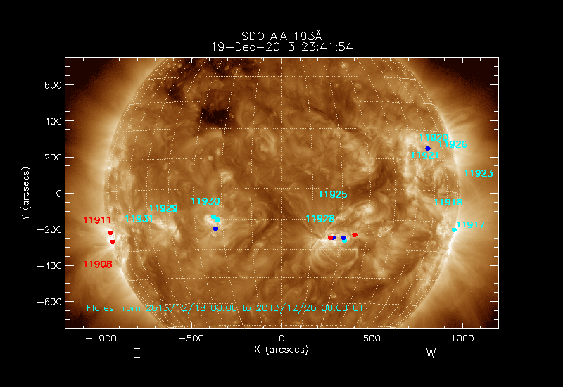 The most recent flares (≤12 hours) are shown as red dots, 12-24 hours ago as blue dots and older ones as turquoise dots.