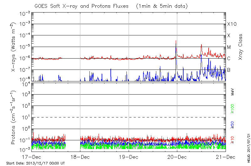 This page provides light-curves generated from GOES soft X-ray and Particle data for the date indicated at the top and the preceding three days.