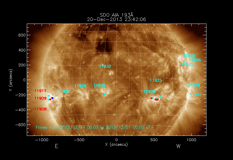 All soft X-ray flares (≥A1.0) where the location has been determined are shown; the flare locations are rotated to the time of the image