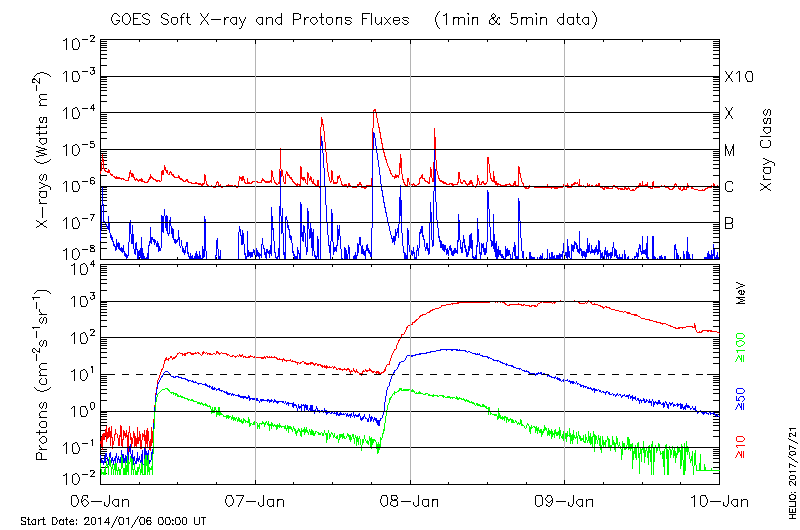 This page provides light-curves generated from GOES soft X-ray and Particle data for the date indicated at the top and the preceding three days.