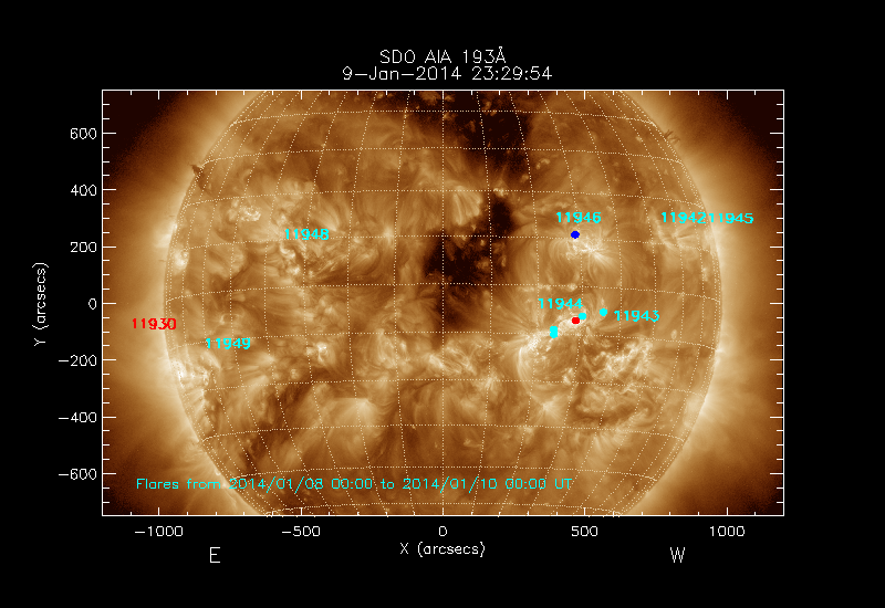 The locations of the flares over-plotted on the image are derived from the flare catalogue