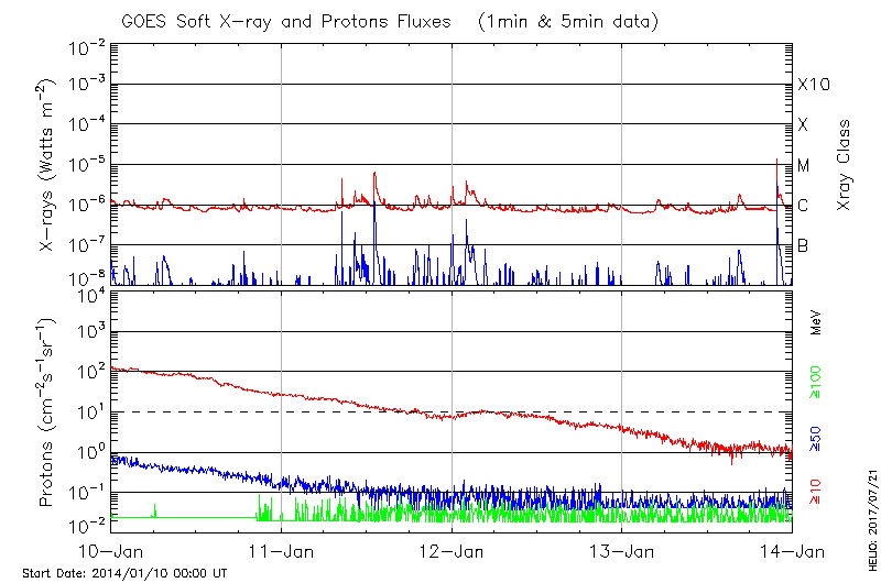 This page provides light-curves generated from GOES soft X-ray and Particle data for the date indicated at the top and the preceding three days.