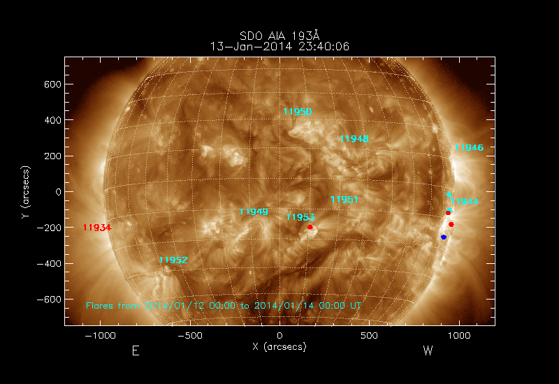 All soft X-ray flares (≥A1.0) where the location has been determined are shown; the flare locations are rotated to the time of the image
