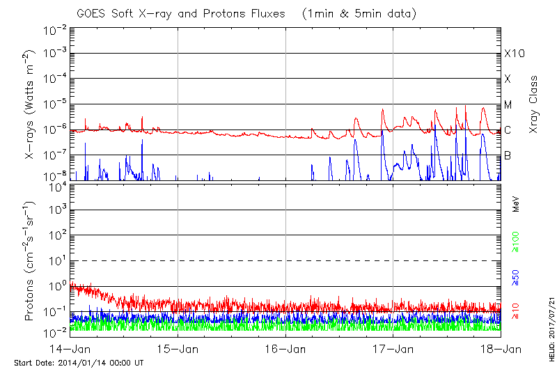 This page provides light-curves generated from GOES soft X-ray and Particle data for the date indicated at the top and the preceding three days.