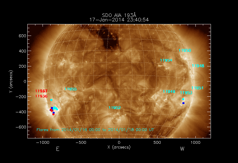 All soft X-ray flares (≥A1.0) where the location has been determined are shown; the flare locations are rotated to the time of the image