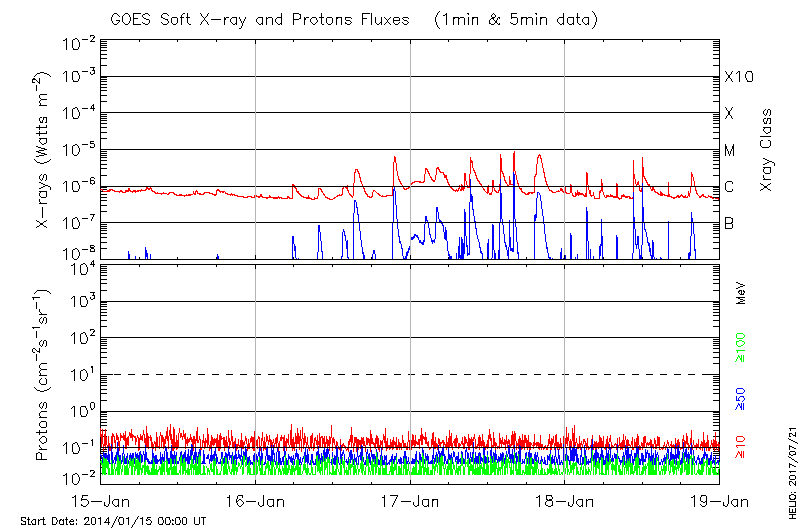 This page provides light-curves generated from GOES soft X-ray and Particle data for the date indicated at the top and the preceding three days.