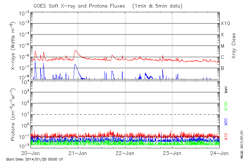 This page provides light-curves generated from GOES soft X-ray and Particle data for the date indicated at the top and the preceding three days.