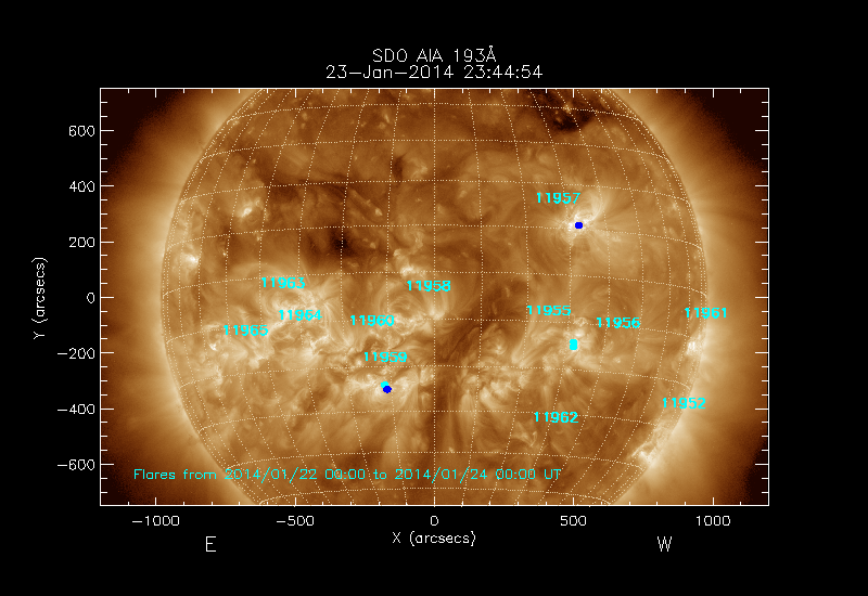 All soft X-ray flares (≥A1.0) where the location has been determined are shown; the flare locations are rotated to the time of the image