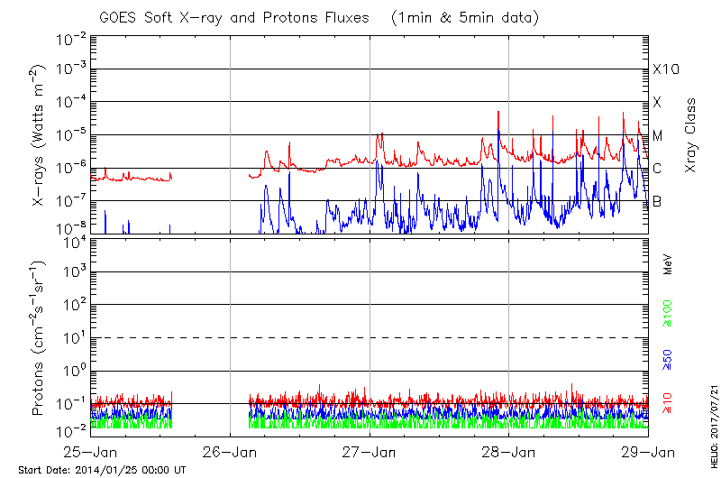 This page provides light-curves generated from GOES soft X-ray and Particle data for the date indicated at the top and the preceding three days.