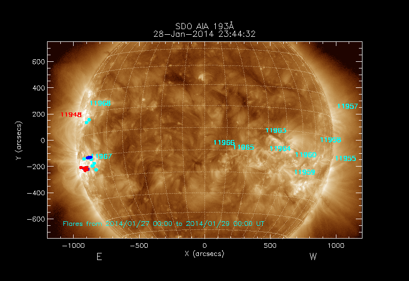 All soft X-ray flares (≥A1.0) where the location has been determined are shown; the flare locations are rotated to the time of the image
