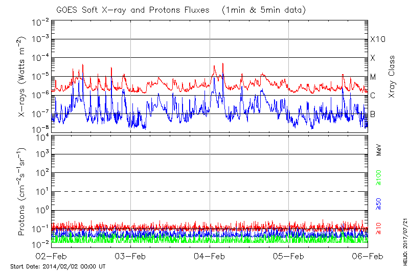 This page provides light-curves generated from GOES soft X-ray and Particle data for the date indicated at the top and the preceding three days.