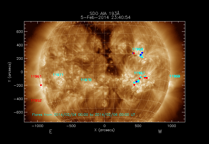 The locations of the flares over-plotted on the image are derived from the flare catalogue