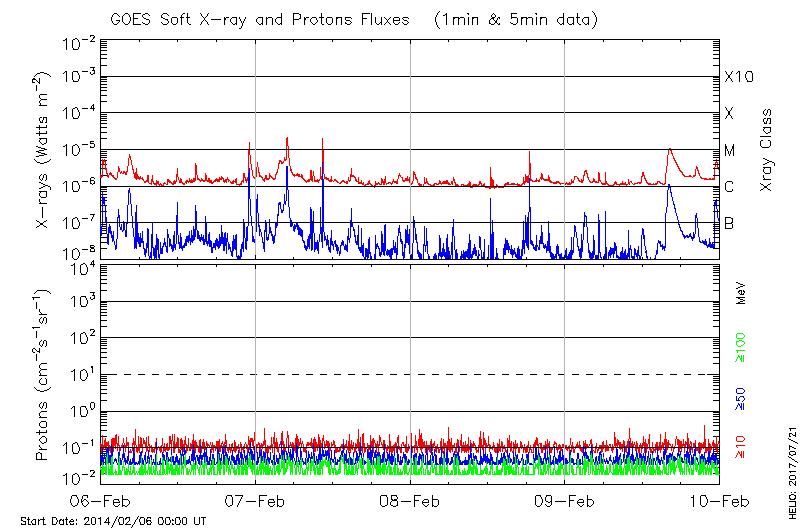 This page provides light-curves generated from GOES soft X-ray and Particle data for the date indicated at the top and the preceding three days.