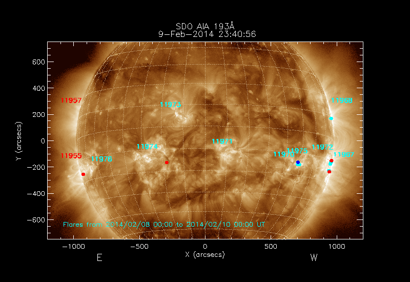 All soft X-ray flares (≥A1.0) where the location has been determined are shown; the flare locations are rotated to the time of the image