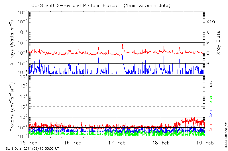 This page provides light-curves generated from GOES soft X-ray and Particle data for the date indicated at the top and the preceding three days.