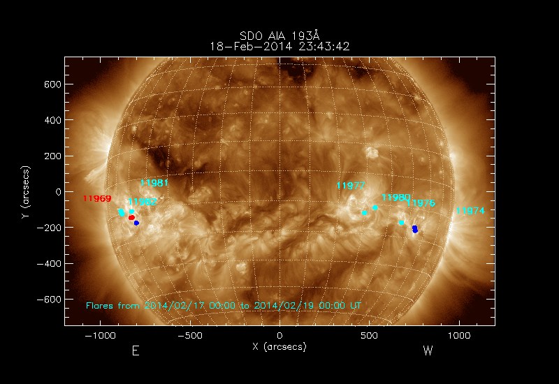 All soft X-ray flares (≥A1.0) where the location has been determined are shown; the flare locations are rotated to the time of the image