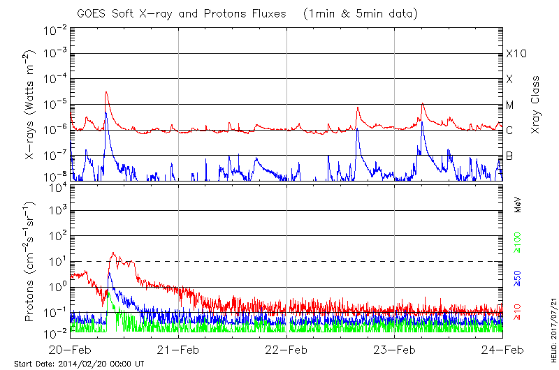 This page provides light-curves generated from GOES soft X-ray and Particle data for the date indicated at the top and the preceding three days.