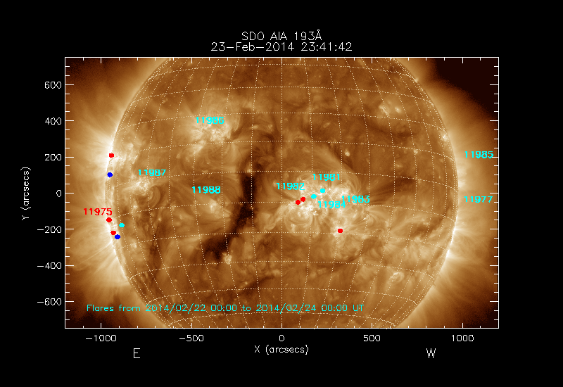 All soft X-ray flares (≥A1.0) where the location has been determined are shown; the flare locations are rotated to the time of the image