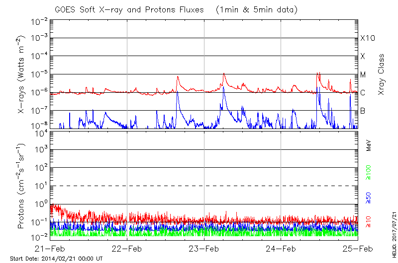 This page provides light-curves generated from GOES soft X-ray and Particle data for the date indicated at the top and the preceding three days.