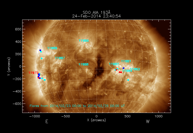 All soft X-ray flares (≥A1.0) where the location has been determined are shown; the flare locations are rotated to the time of the image