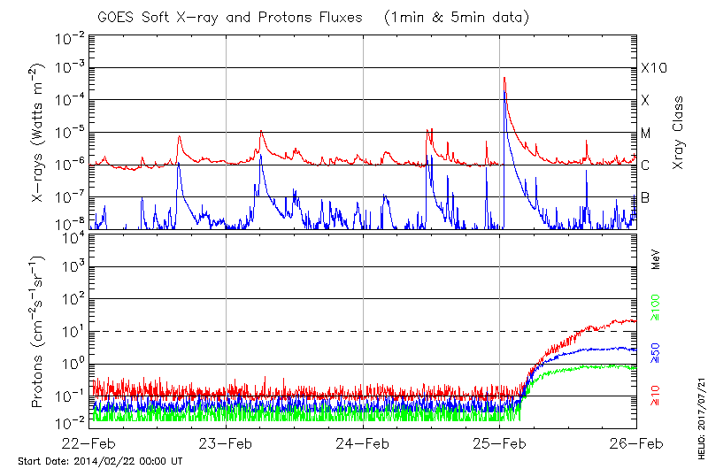 This page provides light-curves generated from GOES soft X-ray and Particle data for the date indicated at the top and the preceding three days.